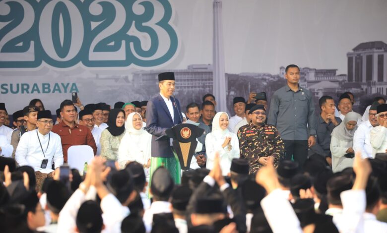 Selanjutnya, Presiden Jokowi menyatakan rasa syukurnya karena dapat berkumpul dan bersilaturahmi dalam Peringatan Hari Santri 2023 di Surabaya, meskipun baru saja tiba di tanah air setelah kunjungannya ke Arab Saudi.